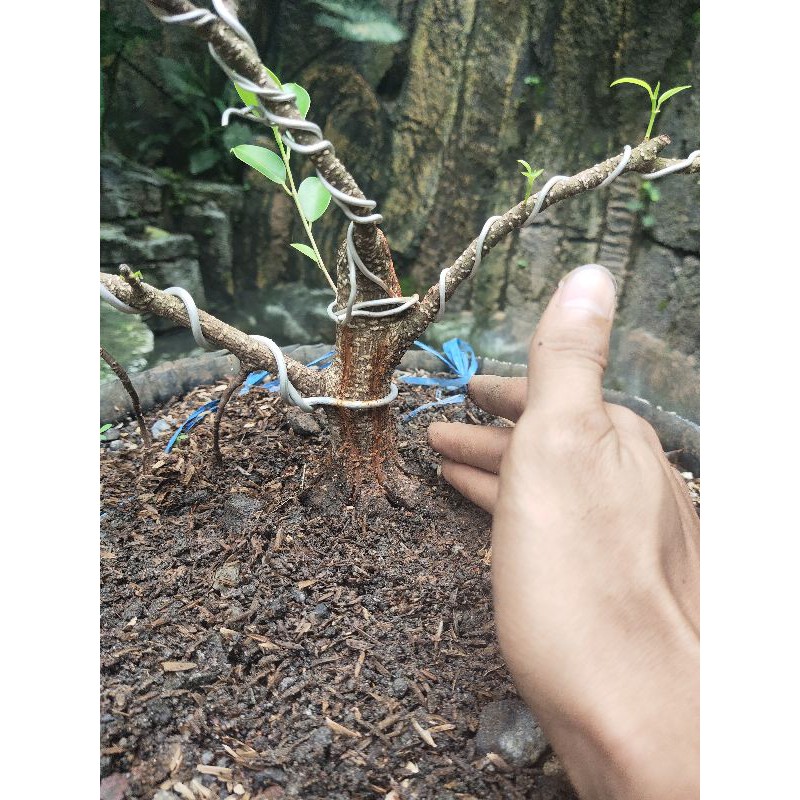 Program Akar Bonsai Kimeng. Program akar bahan bonsai beringin kimeng ficus microcarpa. Teknik yang digunakan yaitu belah batang bawah kemudian ditanam beralaskan pecahan genting.